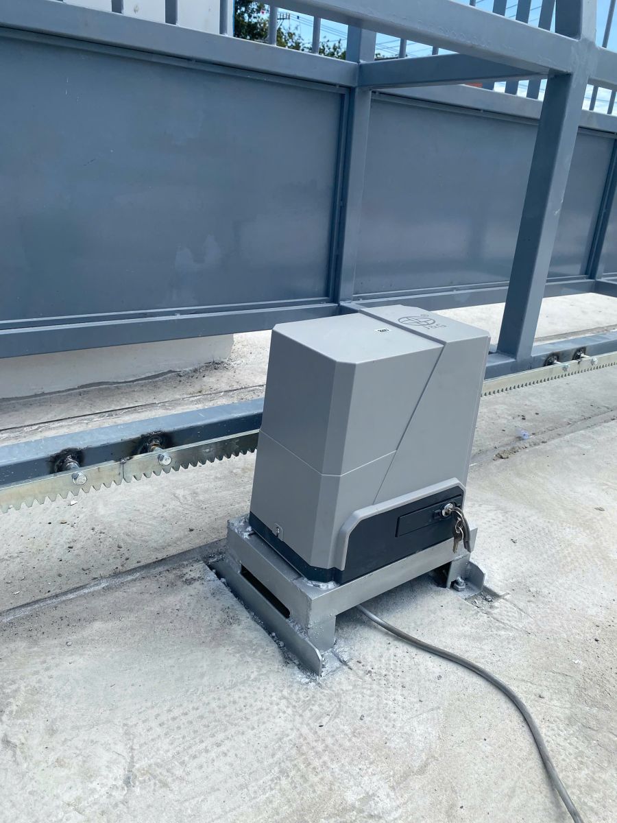 Motor cổng trượt tự động JG sử dụng cơ cấu truyền động thanh răng và bánh răng để điều khiển việc đóng mở cánh cổng thông qua remote điều khiển từ xa.